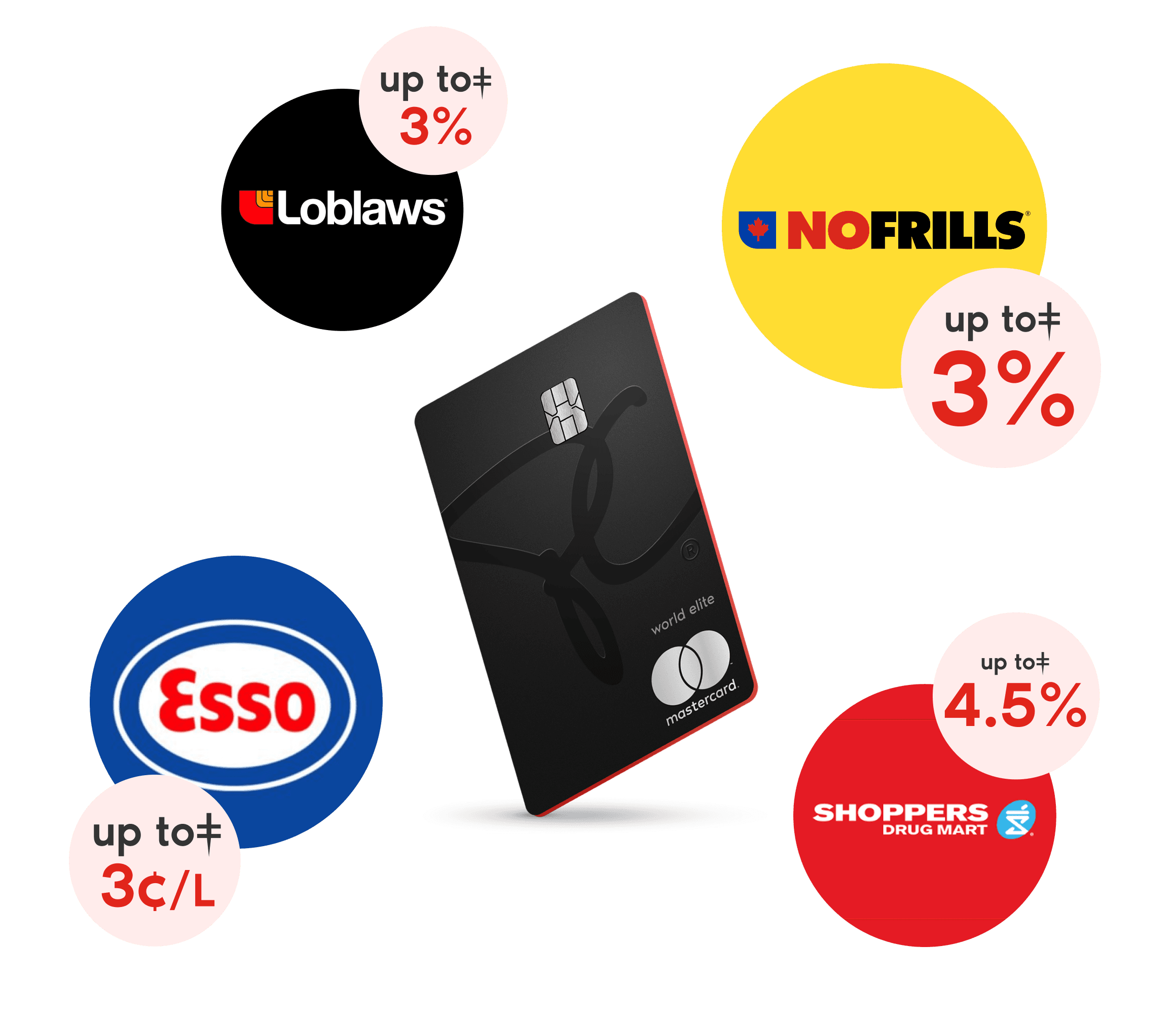 Carte World EliteMD MastercardMD PCMD : Ne comporte aucuns frais annuels, et offre 4,5 % de remise en points chez PharmaprixMD et Shoppers Drug MartMD2 et 3 % de remise en points* dans les supermarchés participants1.