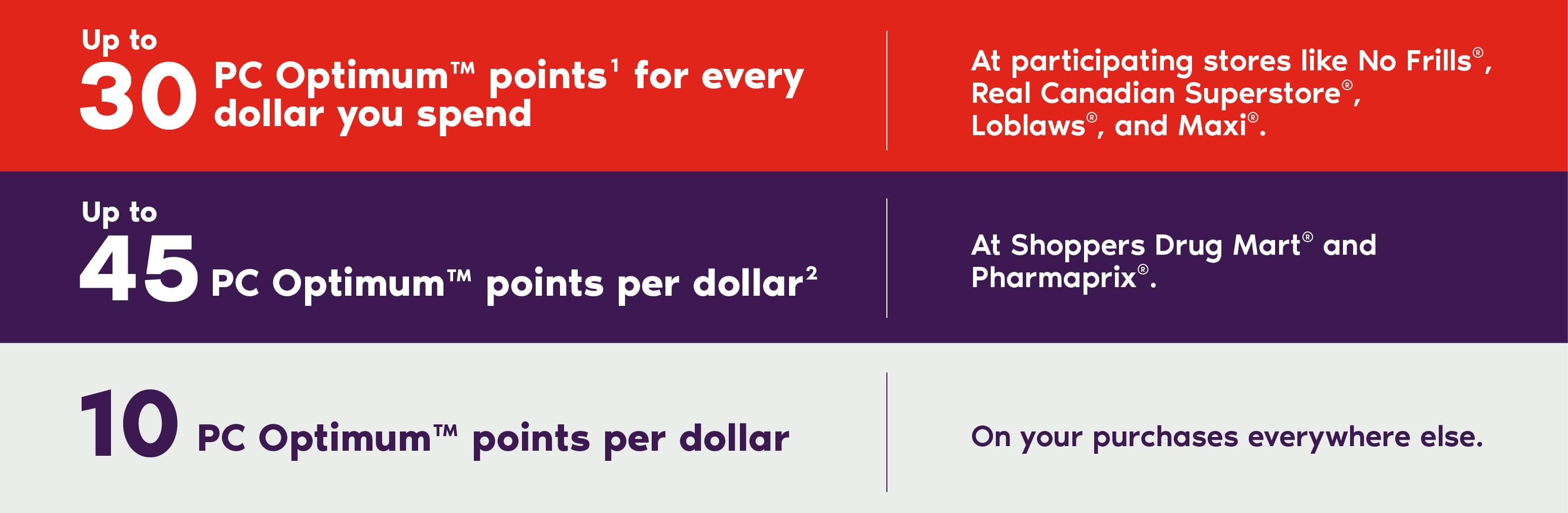 1Earn a minimum of 10 PC Optimum™ points per dollar on all of your purchases charged to the credit card. Any bonus PC Optimum™ points offers available to all PC Financial® Mastercard® customers are calculated based on the regular earnings rate of 10 PC Optimum™ points per dollar spent. This offer may be terminated or changed at any time.