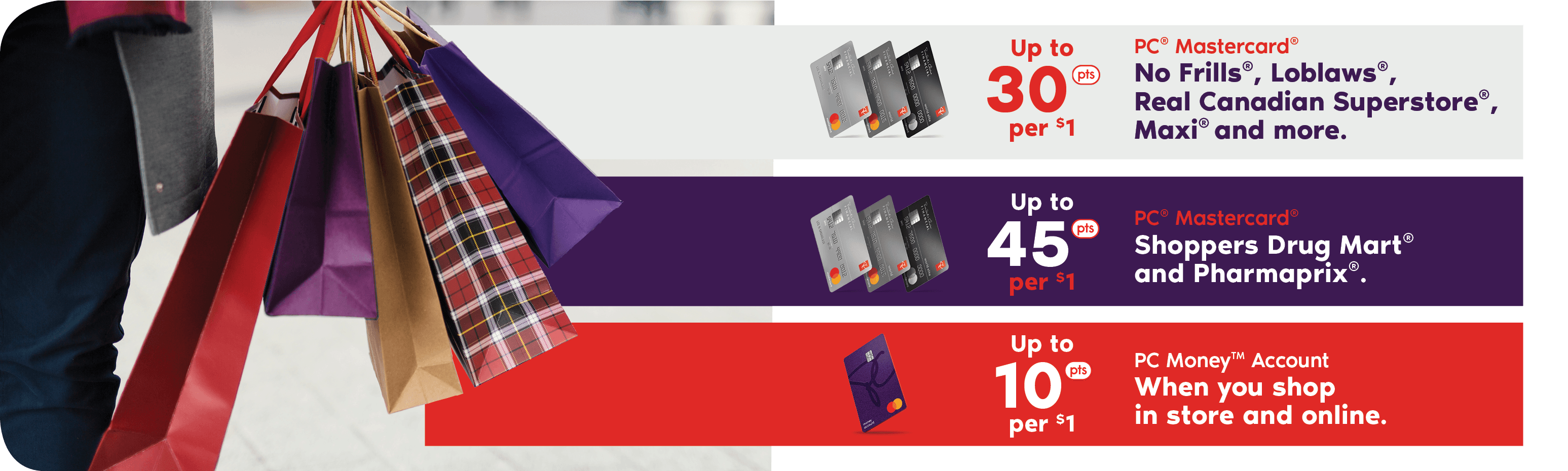 ¹Earn a minimum of 10 PC Optimum™ points per dollar on all of your purchases charged to the credit card. Any bonus PC Optimum™ points offers available to all PC Financial® Mastercard® customers are calculated based on the regular earnings rate of 10 PC Optimum™ points per dollar spent. This offer may be terminated or changed at any time.