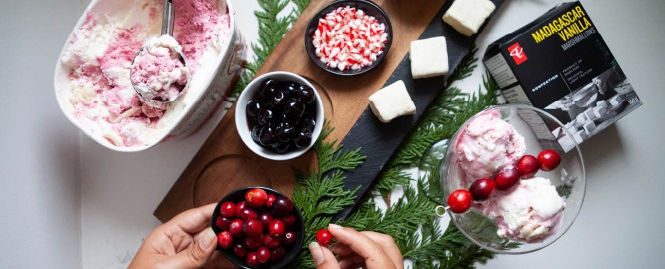 Dessert: PC® Cranberry Vanilla with White Chocolatey Fudge Crackle™ Ice Cream, PC® Black Label Madagascar Vanilla Marshmallows, PC® Praline Pecans, PC® Milk Chocolate Toffee Hazelnuts, PC® Black Label Amarena Cherries in Syrup.