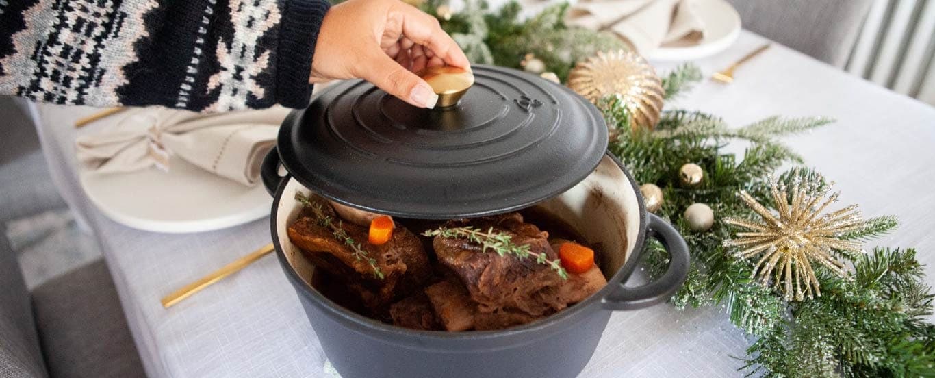 Mains: PC® World of Flavours French Style Braising Beef Short Ribs prepared in the PC® Black Enameled Cast Iron Dutch Oven, PC® Tourtière.