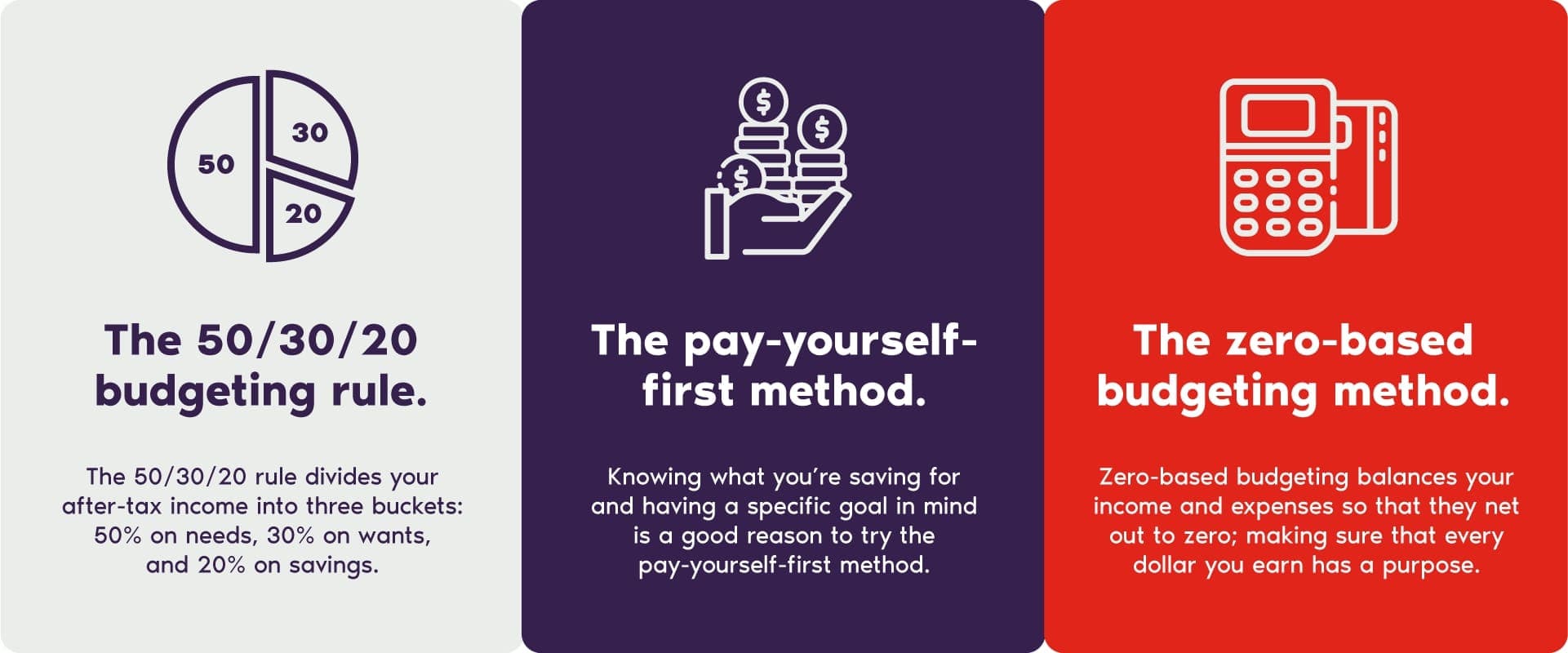 Now it’s time to choose your budgeting style. Three popular methods are the 50 30 20 rule, the pay-yourself-first method, and the zero-based budgeting method. Here’s what you need to know about each style: