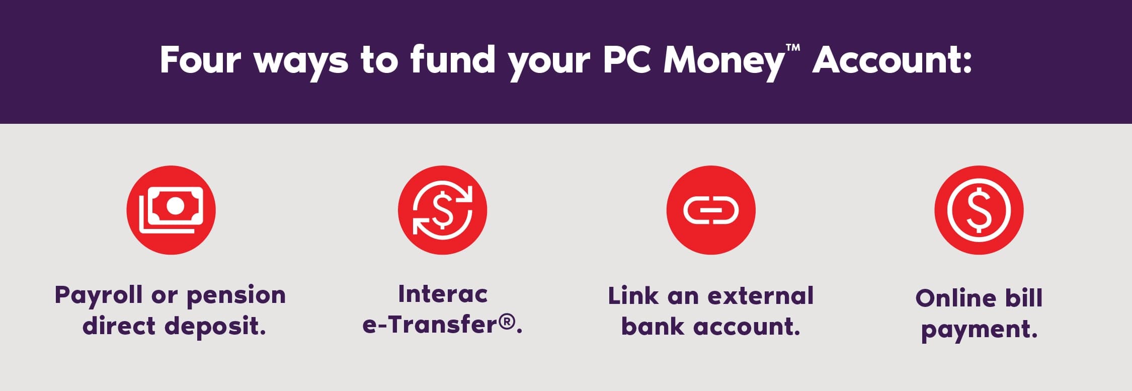 Fund via Interac e-Transfer® deposit: A fast and easy way to fund your PC Money™ Account. To make funding your account with Interac e-Transfer® even easier, see how to set up auto deposit to your PC Money™ Account here (opens in a new window).