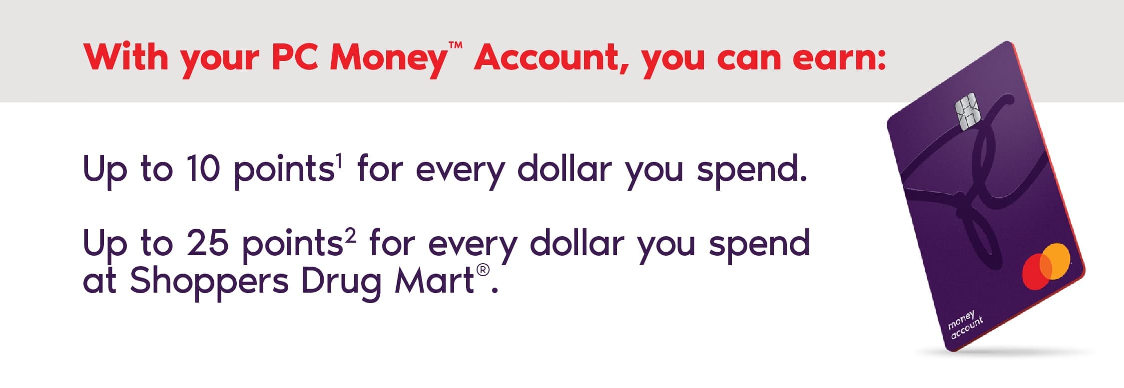¹Earn at least 5 PC Optimum™ points per dollar on qualifying purchases with your PC Money™ Account, wherever your card is accepted. Earn 10 PC Optimum™ points (5 regular PC Optimum™ points plus a bonus of 5 PC Optimum™ points) per dollar on qualifying purchases at participating Loblaw banner stores, Shoppers Drug Mart® stores, Joe Fresh® stores, and Esso™ and Mobil™ stations in Canada. Bill payments, electronic funds transfers, account fees and interest are not qualifying purchases for the purpose of earning PC Optimum™ points. PC Optimum™ points will be deducted for any credits or returns. President's Choice Bank reserves the right to cancel, change or extend regular and bonus points earning rates at any time. Account must be in good standing at time of qualifying transaction and awarding of points. Minimum redemption is 10,000 PC Optimum™ points (worth $10 in rewards) and in increments of 10,000 points thereafter at participating stores where President’s Choice® products are sold. Some redemption restrictions apply; visit pcoptimum.ca for details, participating stores and full loyalty terms and conditions.