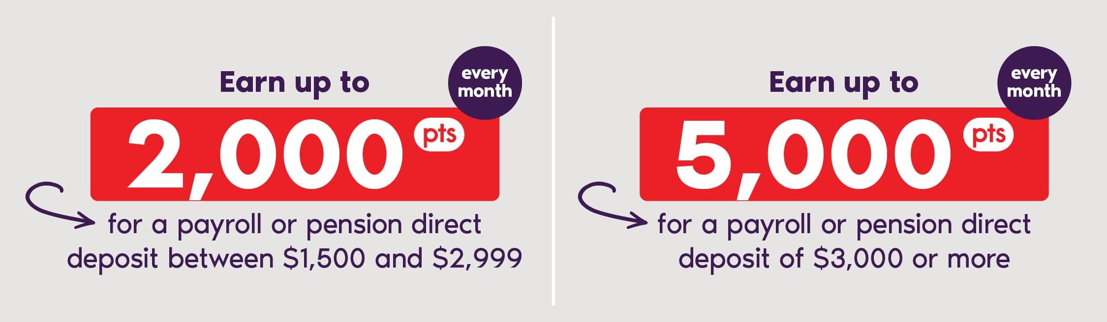 Not only is it a great way to keep your PC Money™ Account always funded, but it’s a brilliant way to earn points every month with just a onetime setup. Attach your payroll or pension direct deposit to your PC Money™ Account in a few easy steps (opens in a new window) and start earning points for getting paid. Here’s how the points⁴ break down: