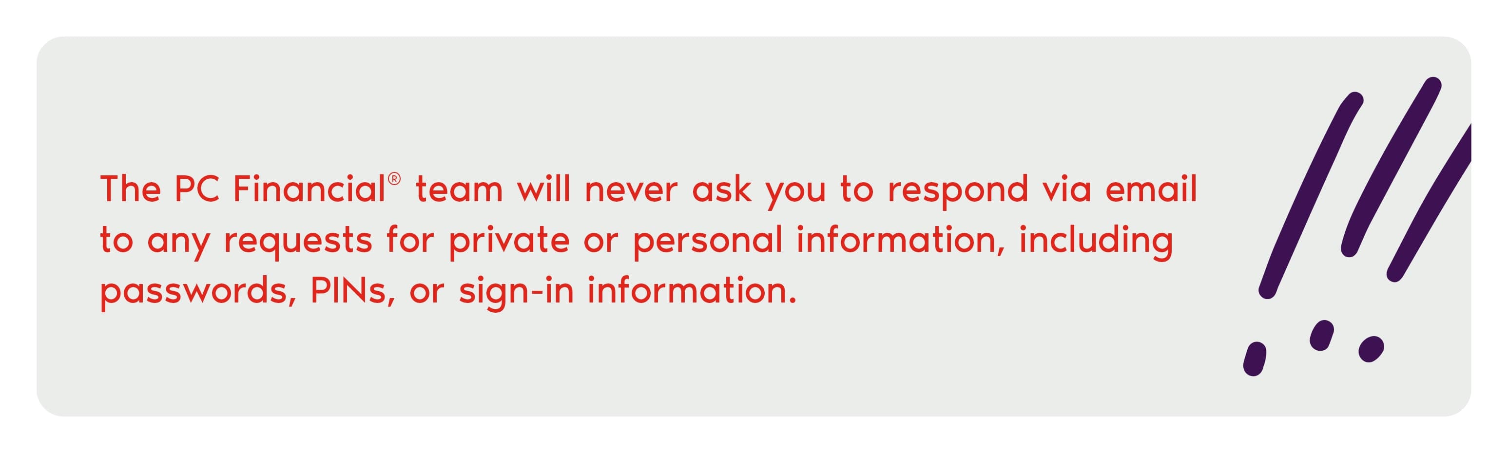 Never respond to emails or texts asking for your PIN or password, sign-in, or account information. This is typically not the way legitimate companies get in touch. The PC Financial® team will never ask you to respond via email to any requests for private or personal information, including passwords, PINs, or sign-in information. Learn more about our security features, some common fraud schemes, and how to protect yourself online here (opens in a new window).