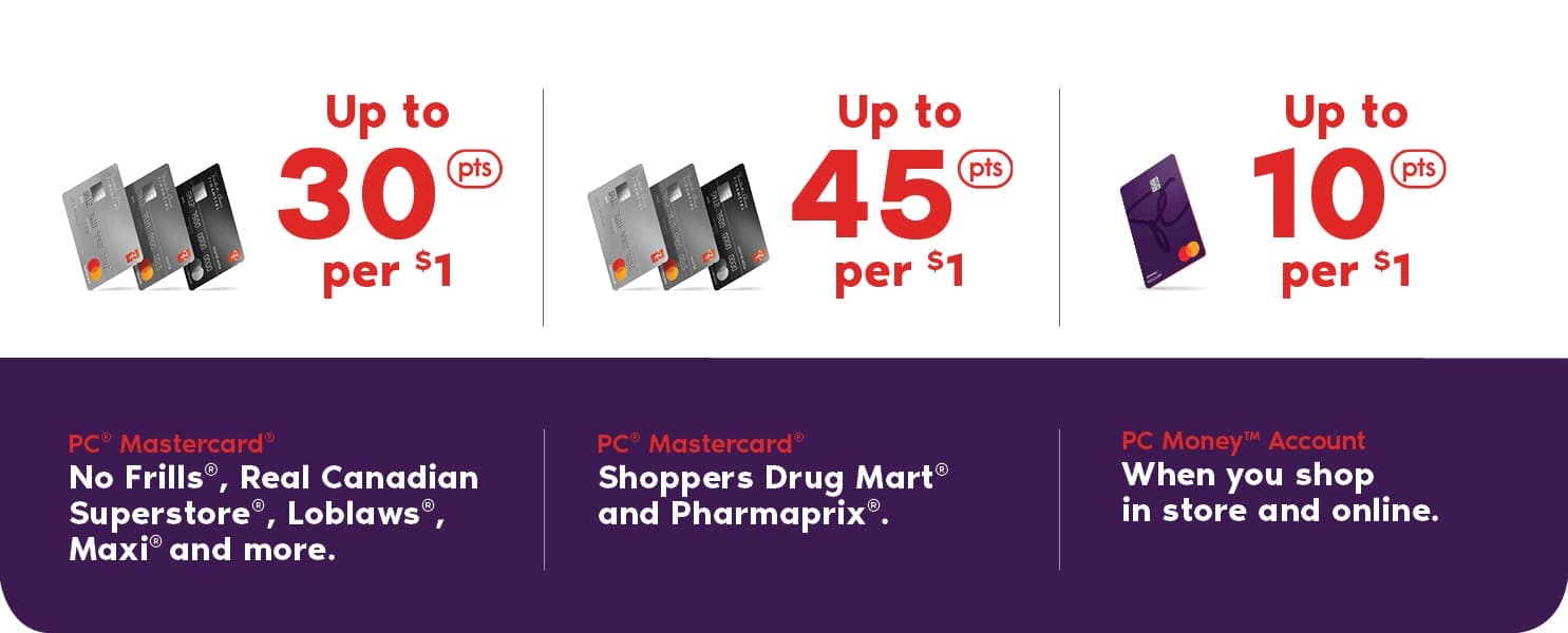 2All PC Optimum™ members earn 15 points per dollar on eligible purchases at Shoppers Drug Mart® and Pharmaprix®. When you use your PC Financial® Mastercard® you will earn additional points per dollar: 10 points per dollar for PC Financial® Mastercard® cardholders; 20 points per dollar for PC Financial® World Mastercard® cardholders; and 30 points per dollar for PC Financial® World Elite Mastercard® cardholders.