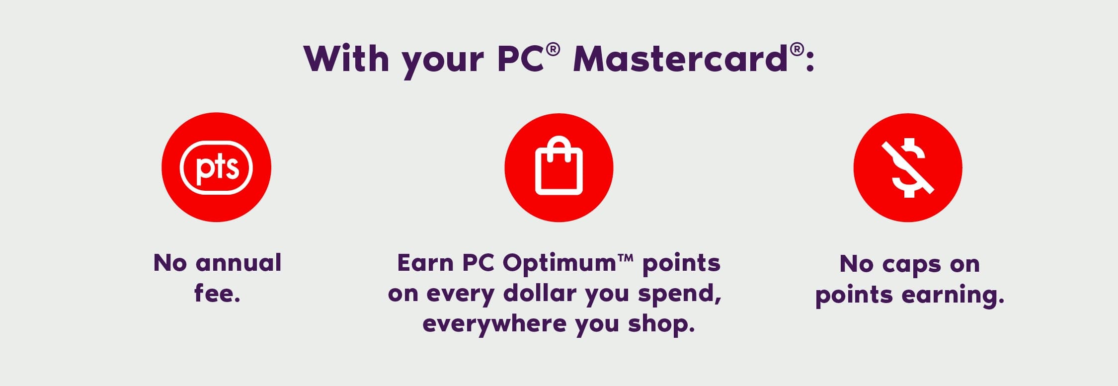 ¹Earn a minimum of 10 PC Optimum™ points per dollar on all of your purchases charged to the credit card. Any bonus PC Optimum™ points offers available to all PC Financial® Mastercard® customers are calculated based on the regular earnings rate of 10 PC Optimum™ points per dollar spent. This offer may be terminated or changed at any time.