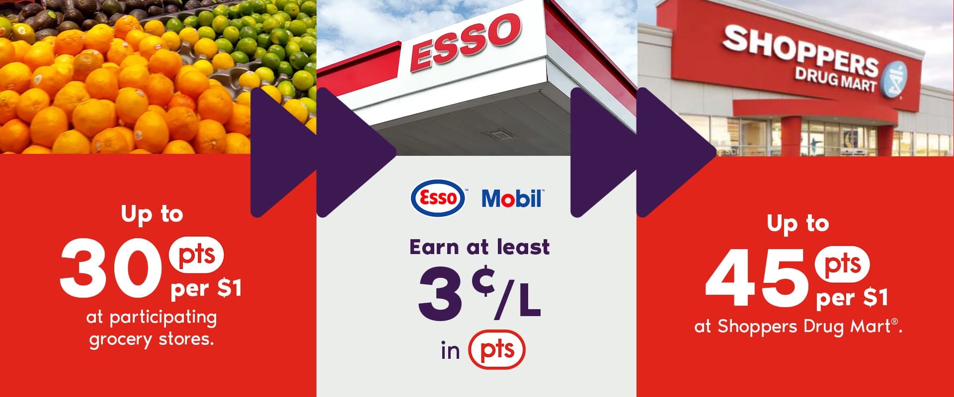 ³Points amount shown includes the 10 points per dollar for all purchases with the PC Financial® Mastercard®. In addition, earn at least 10 PC Optimum™ points per purchased litre of gasoline or diesel fuel at Esso™ and Mobil™ stations in Canada when you pay with your PC Financial® Mastercard®. You will also earn at least 10 PC Optimum™ points per litre available to all PC Optimum™ loyalty members at Esso™ and Mobil™ stations in Canada. Earn an additional 10 points per litre of premium gasoline (Octane 89, 91, 93) at Esso™ and select Mobil™ Stations. You could earn even more points at Mobil™ stations located adjacent to a Loblaw banner grocery store. Exact earn rate is available at the station. Should fuel prices fall below $1/L, causing total points per litre awarded to fall below 30 points per litre, points will be topped up to ensure a minimum of 30 points per litre are awarded in all transactions paid with a PC Financial® Mastercard® at Esso™ and Mobil™ locations. For full details including how points are awarded to your PC Optimum™ account and rounding rules, visit pcfinancial.ca/en/legal-stuff/pc-optimum-mastercard/.
