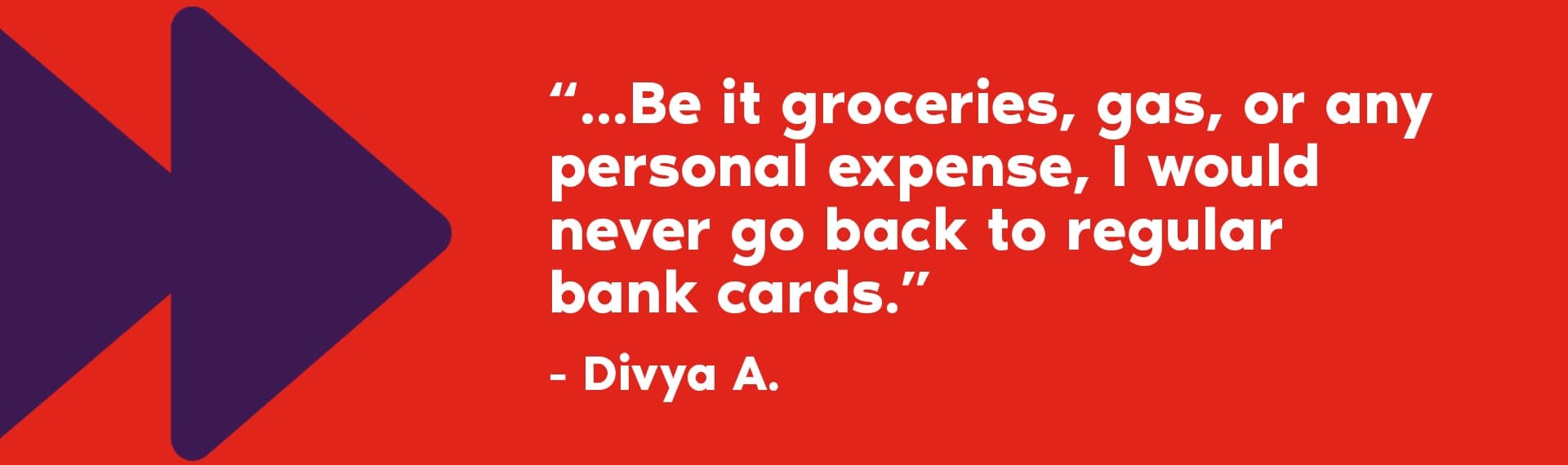 ''I love how quickly points accumulate. Be it groceries, gas, or any personal expense, I would never go back to regular bank cards.” - Divya A.