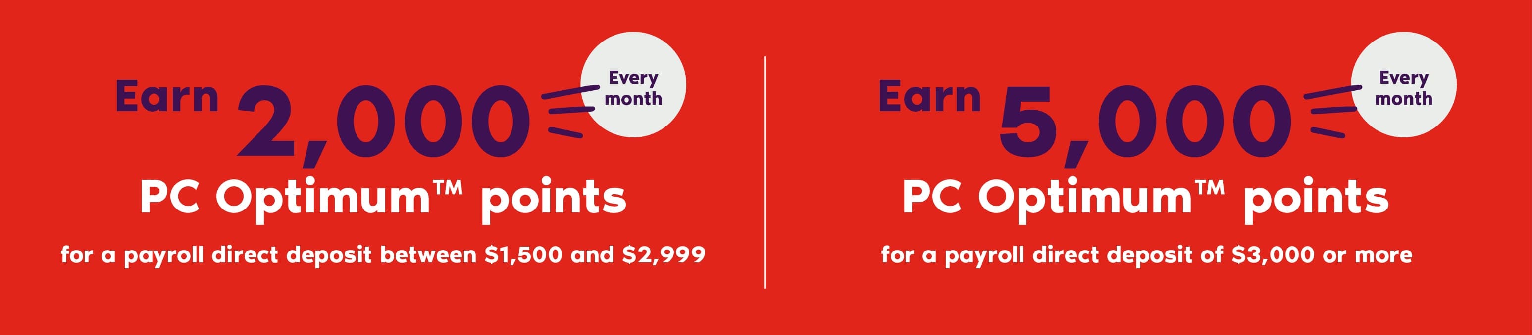 *Earn a monthly bonus of up to 5,000 PC Optimum™ points when you deposit funds to your PC Money™ Account using automatic payroll or pension direct deposits. Payroll or pension deposits totaling between $1,500 and $2,999 within a calendar month will earn a bonus of 2,000 PC Optimum™ points, and deposits totaling greater than $2,999 will earn an additional 3,000 PC Optimum™ points, for a maximum monthly bonus of 5,000 PC Optimum™ points. Limited to one bonus per customer, per month, even If you have multiple PC Money™ Accounts. The classification of a direct deposit as a payroll or pension direct deposit is determined solely by President’s Choice Bank. Interac e-Transfer® services, electronic funds transfers, and other forms of deposits or transfers to your account do not count towards this bonus. Bonus points will be awarded to your PC Optimum™ account within 2-3 business days of when you meet the minimum direct deposit amount(s).