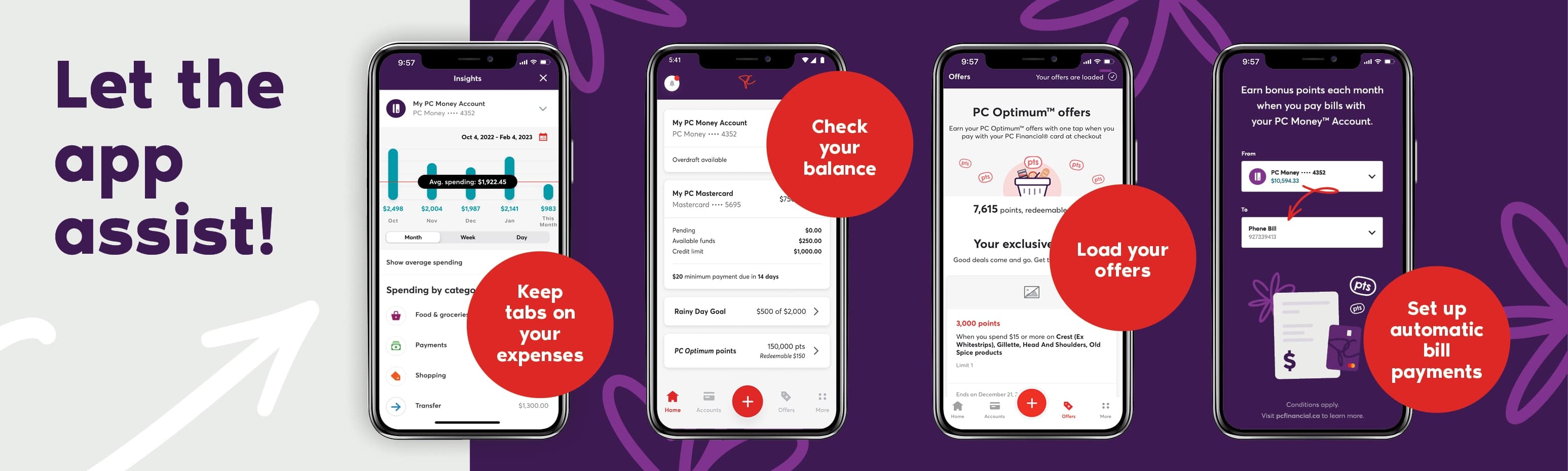 Simple and efficient — banking (opens in a new window) should be both. So, if you haven’t downloaded the PC Financial® app yet, why not? Use the Insights feature in the PC Financial® app to keep track of your expenses by category and use it to help create your own budget. Check your PC Financial® card and PC Optimum™ points balances, load your PC Optimum™ offers right in the app, and set up automatic bill payments with your PC Money™ Account to put your bills on auto-pilot and earn points for paying them. Did you know you can earn up to 5,000 bonus PC Optimum™ points⁵ with up to five $50+ bill payments every month?