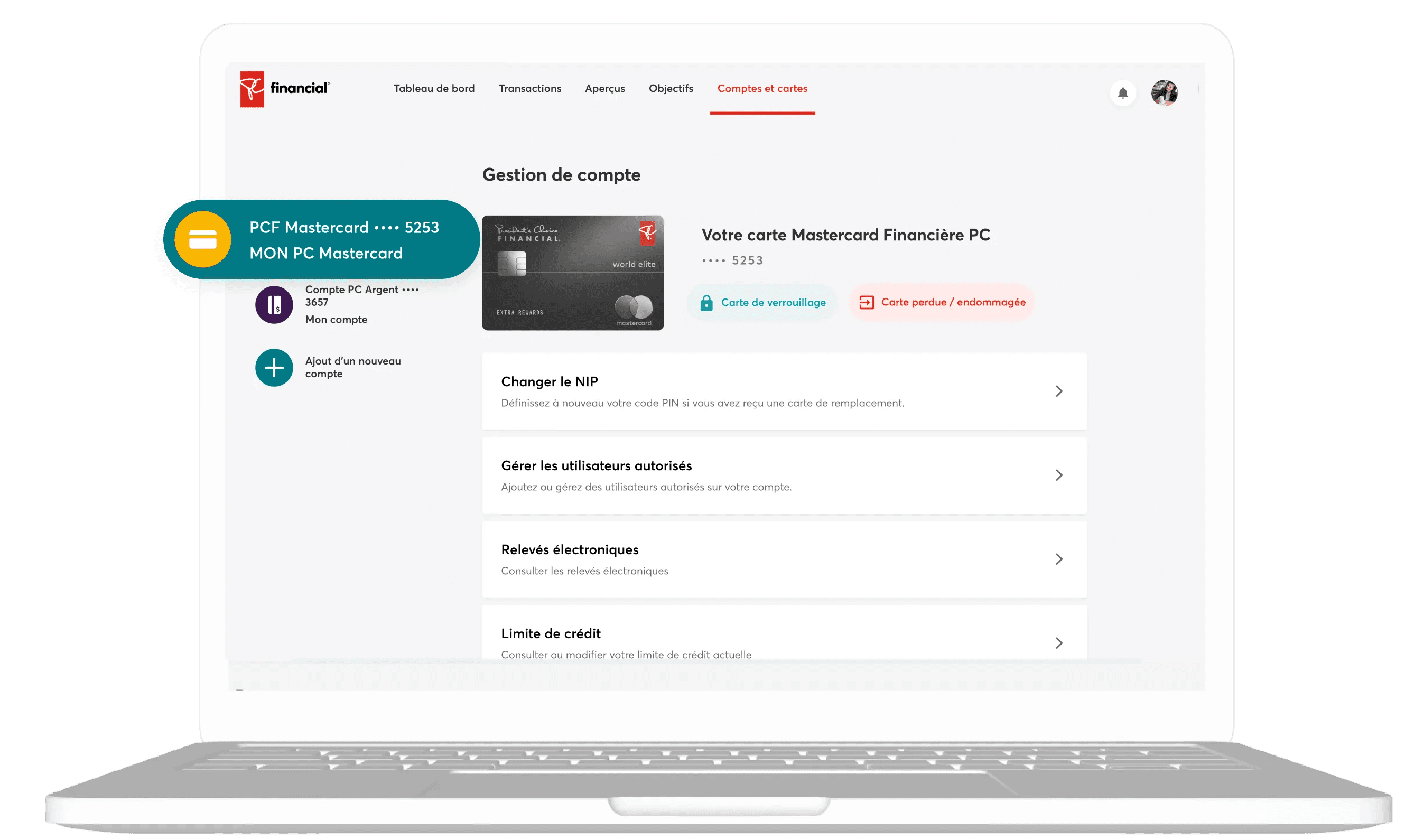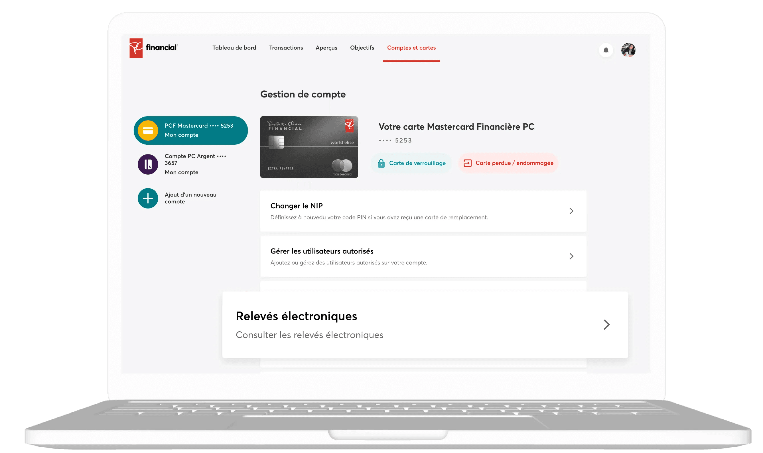 Créez un compte en ligne sur pcfinance.ca ou téléchargez l'application mobile PC FinanceMD, puis inscrivez-vous aux relevés électroniques pour faire un suivi facile de vos achats en toute facilité, diminuer la paperasse, etc.