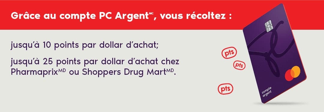 ¹ Récoltez un minimum de 5 points PC OptimumMC par dollar d’achat admissible grâce à votre compte PC ArgentMC, partout où l’on accepte la carte. Récoltez 10 points PC OptimumMC (5 points PC OptimumMC standards et une prime de 5 points PC OptimumMC) par dollar d’achat admissible dans les magasins participants de l’enseigne LoblawMD, chez Shoppers Drug MartMD, dans les boutiques Joe FreshMD, ainsi que chez EssoMC et MobilMC au Canada. Les paiements de factures, les virements, les frais de compte et les intérêts ne constituent pas des achats admissibles aux fins de la récolte de points PC OptimumMC. Advenant un crédit ou un retour de la marchandise, les points PC OptimumMC sont retirés de votre compte. La Banque le Choix du Président se réserve le droit d’annuler, de modifier ou de prolonger les taux d’accumulation des points standards et des points en prime en tout temps. Votre compte doit être en règle au moment de la transaction admissible et de l’attribution des points.
