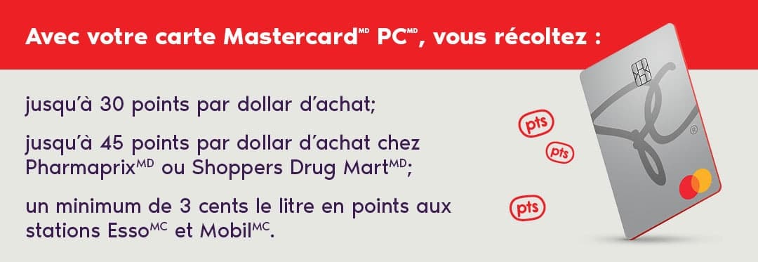 ⁵ Récoltez un minimum de 10 points PC OptimumMC par dollar d’achat porté à votre carte de crédit. Toute offre de points PC OptimumMC en prime présentée à tous les titulaires de carte MastercardMD Services financiers le Choix du PrésidentMD est calculée au taux standard d’accumulation de 10 points PC OptimumMC par dollar d’achat. Nous pouvons mettre fin à cette offre ou la modifier en tout temps.