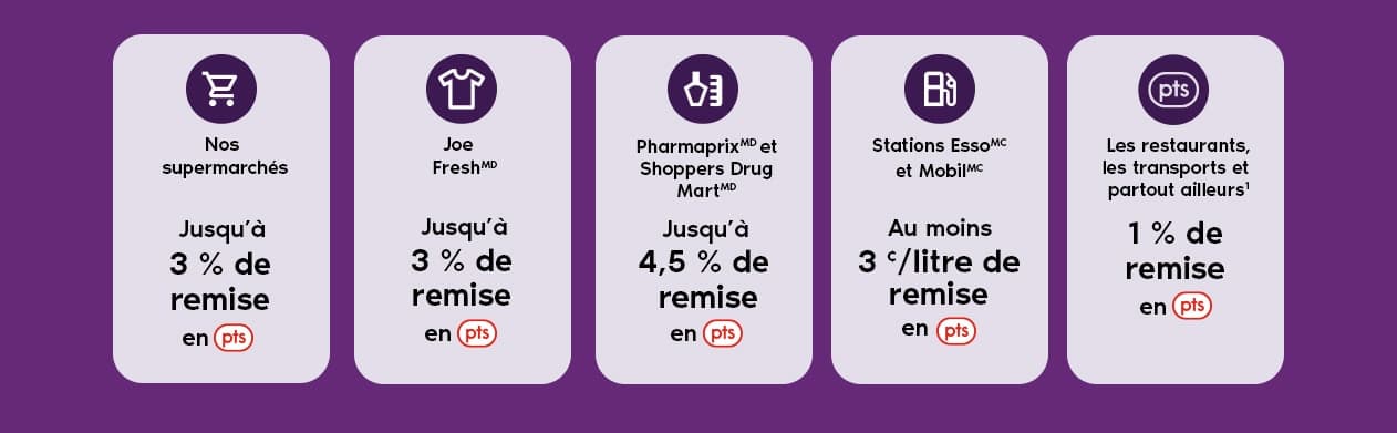 Vous pouvez transformer vos achats courants en points PC OptimumMC n’importe où avec une carte Mastercardᴹᴰ PCᴹᴰ. Obtenez 1 % de remise en points dans les restaurants, les transports et partout ailleurs2 avec un potentiel d’accumulation supplémentaire chez LoblawsMD, Real CanadianMD Superstore, No FrillsMD, Joe FreshMD, PharmaprixMD et Shoppers Drug MartMD. Comme si cela ne suffisait pas, vous pouvez faire le plein de carburant ET de points dans les stations EssoMC et MobilMC participantes au Canada.