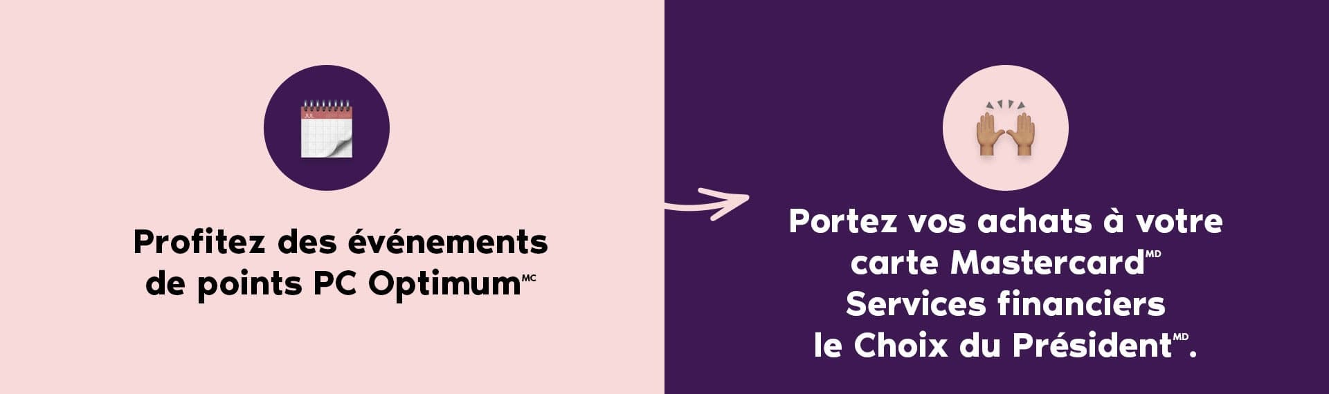 ² Récoltez un minimum de 10 points PC OptimumMC par dollar d’achat porté à votre carte de crédit. Toute offre de points PC OptimumMC en prime présentée à tous les titulaires de carte MastercardMD Services financiers le Choix du PrésidentMD est calculée au taux standard d’accumulation de 10 points PC OptimumMC par dollar d’achat. Nous pouvons mettre fin à cette offre ou la modifier en tout temps.
